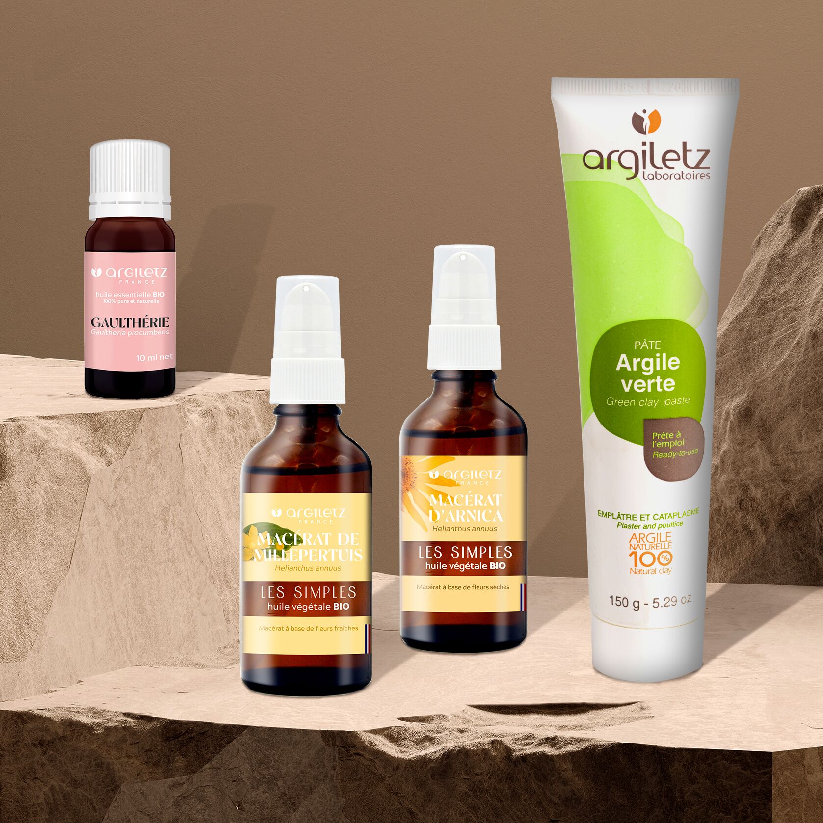 The poultice routine is a complete treatment that includes a paste of green clay (150 gr), an oily macerate of St. John’s wort, an oily macerate of organic arnica and the essential oil of Wintergreen