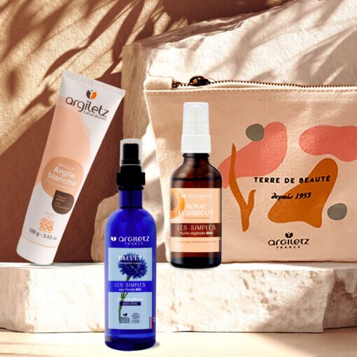 3 essential products to regain a complexion of light: 1 white clay tube 100gr + 1 vegetable oil of apricot kernel + 1 floral water of blueberry in a 100% cotton pouch offered.