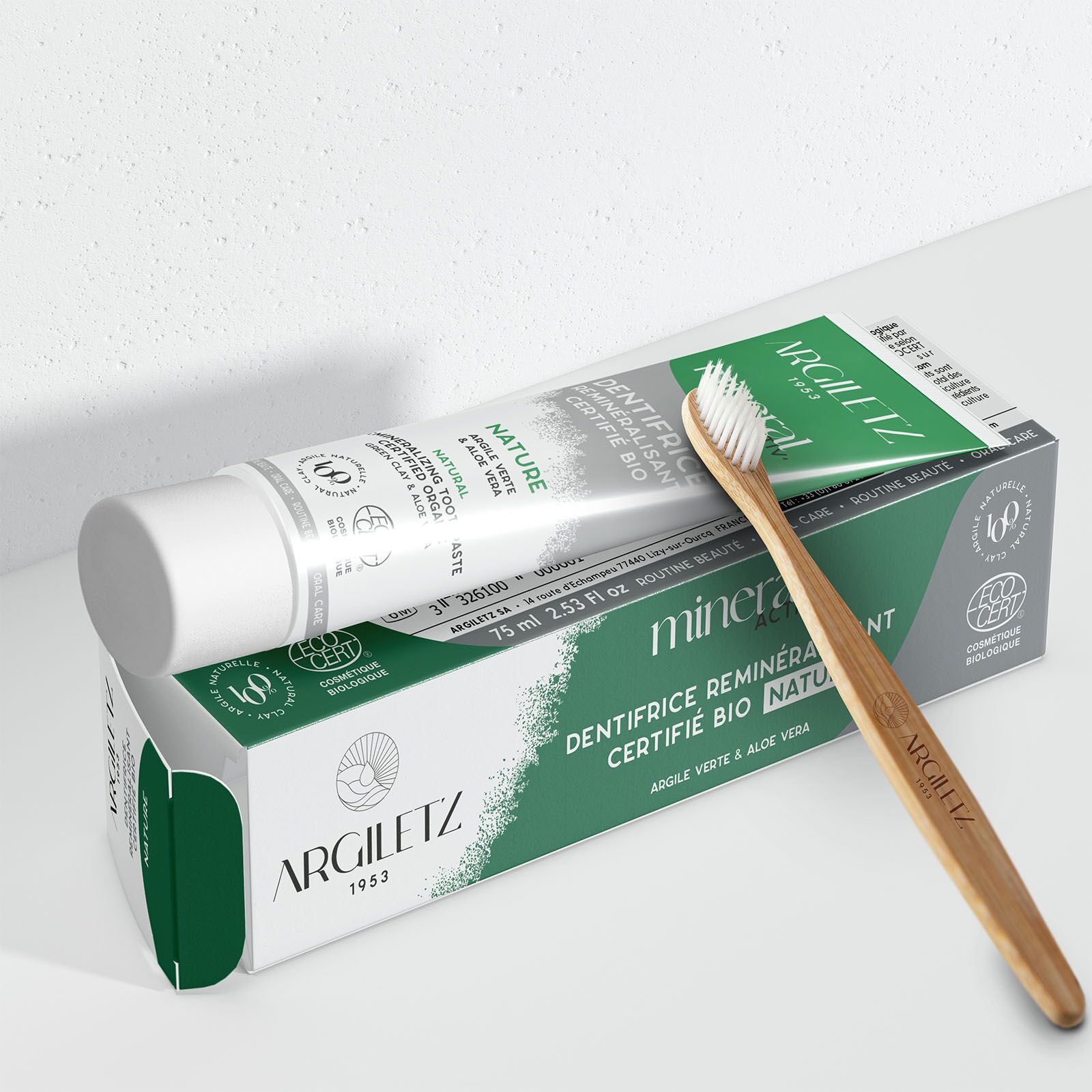La brosse à dents ARGILETZ possède une boite en Kraft et un manche en bambou léger, tous les deux 100% biodégradables.