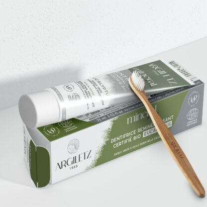 Une brosse à dents écologique en bambou à associer avec notre dentifrice eucalyptus. Ce dentifrice reminéralisant et purifiant à base d’argile verte riche en oligo-éléments apportera à vos gencives une force intense.
